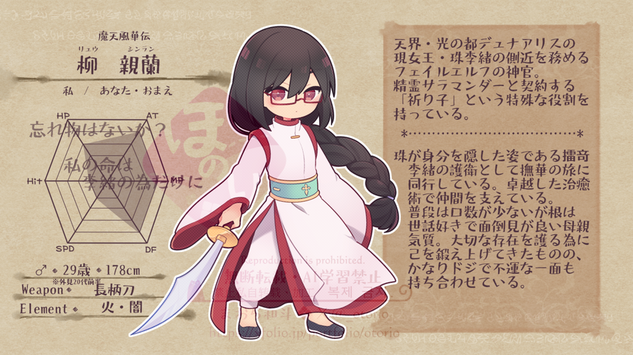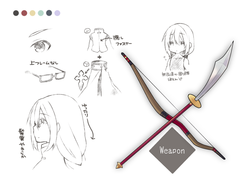 ■eyecolor / ● haircolor / ● ■erement / 火・闇 ■weapon / 長柄刀・弓