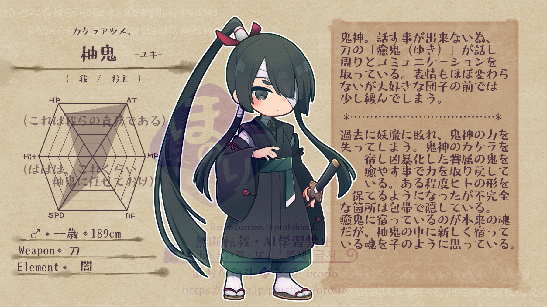 鬼神。話す事が出来ない為、刀の「癒鬼(ゆき)」が話し周りとコミュニケーションを取っている。